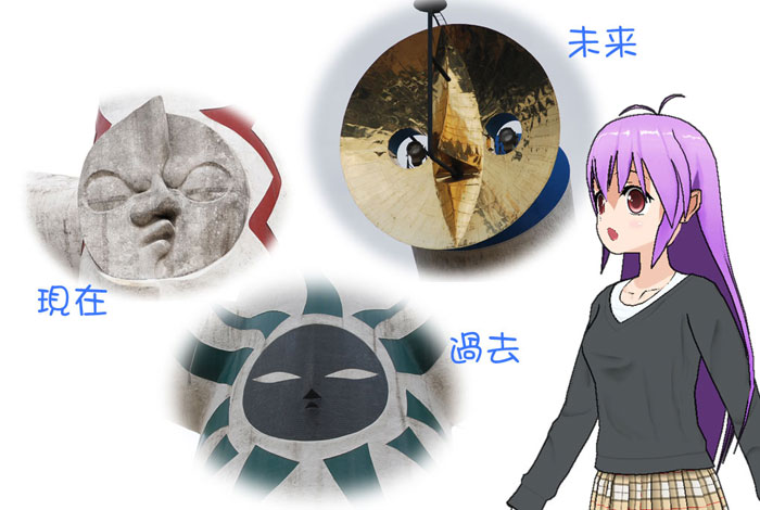 前にある顔は「未来の太陽」、「現在の太陽」を表現してはるんや。そして後方の顔が「過去の太陽」や。それぞれにそういう意味があるらしいでぇ☆