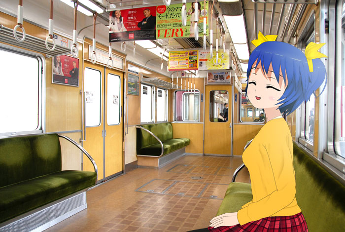 あき: 全然!それよりさっきの鎧戸の凄いけど室内の色も良いね。木目の化粧版に、グリーンのモケット。まさに「和」という感じで京都に行く電車にぴったりだよ。モケットの緑は抹茶をイメージしたのかな。