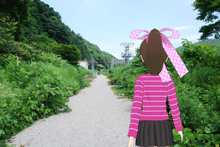 ここが線路跡じゃないかな。ここを通って本線へ・・・。この先にスイッチバックのホームがあるんだよ。