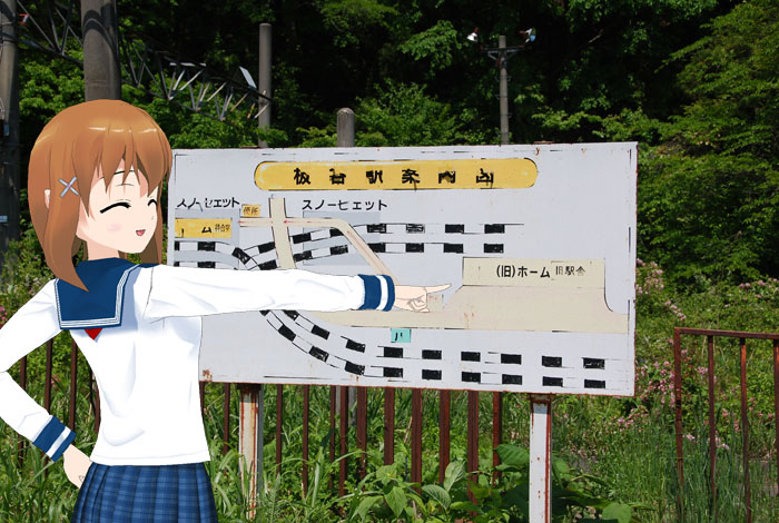 あ、案内板。これも古い感じだね。でも、「(旧)ホーム」って書いてあるから山形新幹線開通後に立てられたものだね。