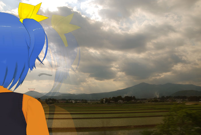 水田がずっと続いているよ。ほら雲の間から射している光も何か神秘的・・・。いいなぁ~。