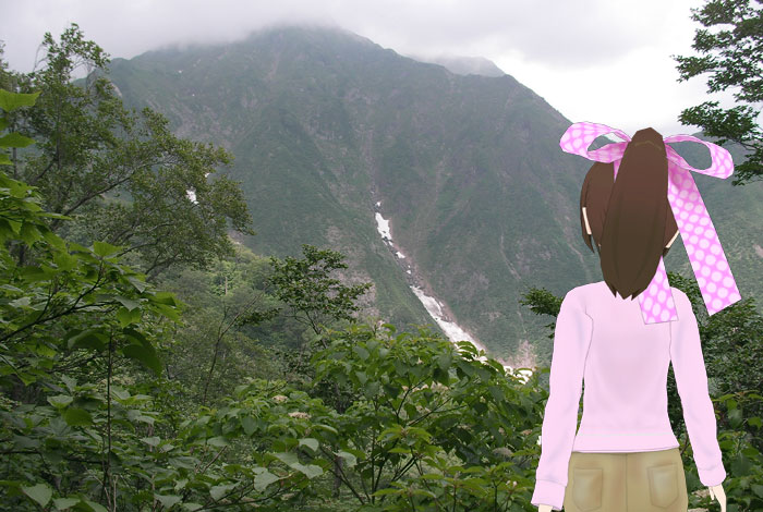 見て!向こう・・・。谷間に雪が残っている・・・。もう7月だよ、凄いね!万年雪なのかな?