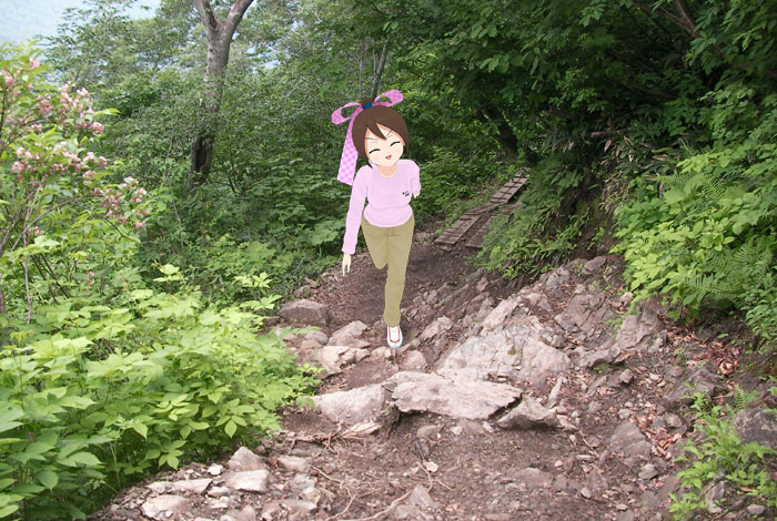 木の遊歩道を過ぎたら岩場。ちょっと谷川岳というイメージになってきたかな?