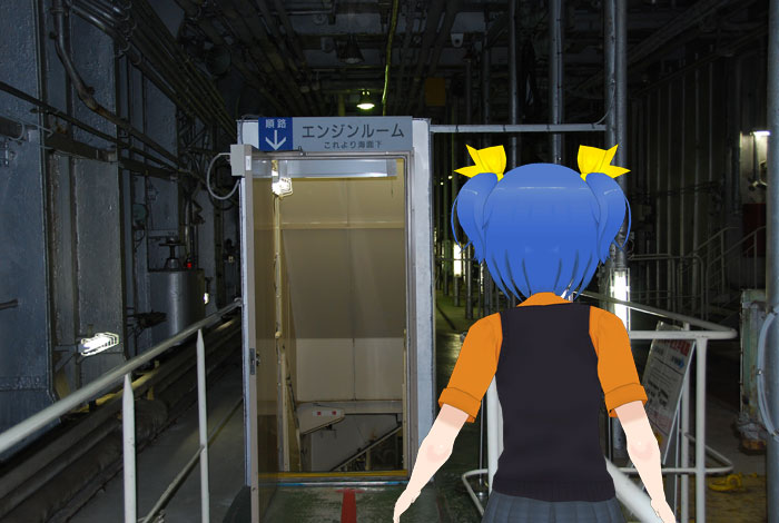 この階段を下りるけどこれより下は喫水線より下、つまり海面下になるんだよ。